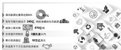 專家預測,到2050年全球能源互聯網初步建成時,清潔能源比重將達到80%,每年可替代相當于240億噸標準煤的化石能源,減排二氧化碳670億噸。屆時,全球溫升控制在2攝氏度以內的目標有望實現。這一發展低碳經濟、實現能源變革轉型的系統性解決方案,贏得潘基文、世界銀行行長金墉、美國能源部長莫尼茲等的高度贊賞和積極支持。