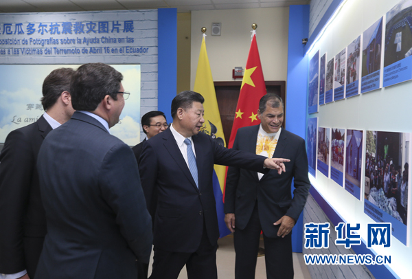 當地時間11月18日,國家主席習近平在基多同厄瓜多爾總統科雷亞共同出席中方援建的厄瓜多爾公共安全應急指揮中心聯合實驗室揭牌儀式,喬內醫院奠基、科卡科多-辛克雷水電站竣工發電視頻連線活動。這是兩國元首共同參觀中方支援厄瓜多爾抗震救災圖片展。新華社記者 蘭紅光 攝