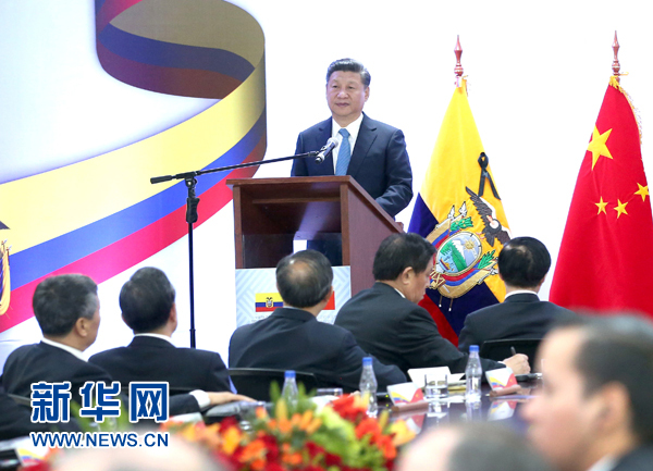 當地時間11月18日,國家主席習近平在基多同厄瓜多爾總統科雷亞共同出席中方援建的厄瓜多爾公共安全應急指揮中心聯合實驗室揭牌儀式,喬內醫院奠基、科卡科多-辛克雷水電站竣工發電視頻連線活動。這是習近平出席活動后致辭。新華社記者 馬占成 攝