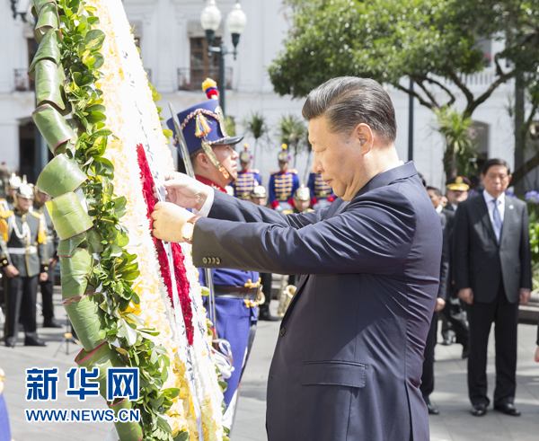 同日,習近平向厄瓜多爾獨立英雄紀念碑敬獻花圈。