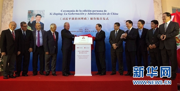 11月19日,在秘魯首都利馬,中宣部常務(wù)副部長、中央文明辦主任黃坤明(右六)與秘魯駐歐盟大使、前外交部長貢薩洛·古鐵雷斯(左五)共同為《習近平談治國理政》秘魯版首發(fā)揭幕。當日,《習近平談治國理政》秘魯版首發(fā)式在秘魯國家圖書館舉行。 新華社記者李明攝