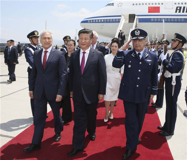 11月22日,國家主席習近平抵達圣地亞哥,對智利共和國進行國事訪問。智利外長穆尼奧斯等在機場迎接習近平和夫人彭麗媛。(新華社記者 蘭紅光 攝)