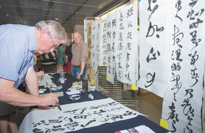 日內瓦大學孔子學院舉辦的中國書法展示活動上,一位當地漢語愛好者展示書法技藝。