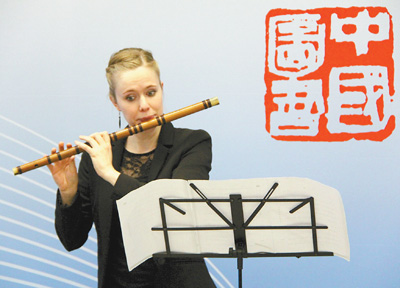 1月11日,在瑞士蘇黎世大學,一名當地學生在“中國圖書中心”揭幕儀式上表演笛子獨奏。