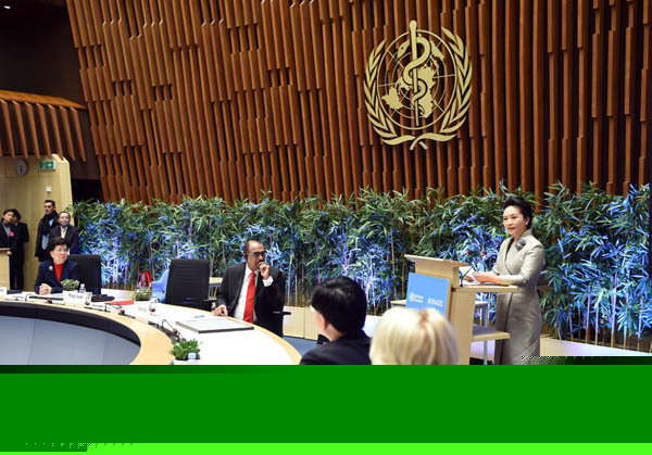1月18日,國家主席習近平夫人、世界衛生組織結核病和艾滋病防治親善大使彭麗媛應世界衛生組織總干事陳馮富珍和聯合國艾滋病規劃署執行主任西迪貝邀請,在瑞士日內瓦出席為她舉行的親善大使任期續延暨頒獎儀式。這是彭麗媛在儀式上致辭。新華社記者謝環馳攝