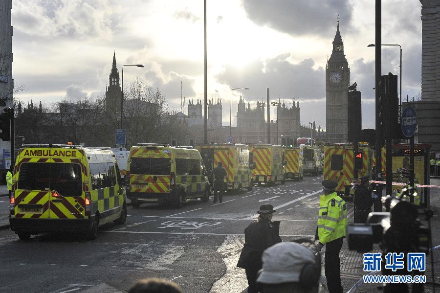 ??? 3月22日,救護車在英國倫敦的議會大廈外待命。 英國警方22日晚宣布,已有4人在倫敦市中心的襲擊事件中死亡,另有20多人受傷。新華社發(蒂姆·愛爾蘭攝)