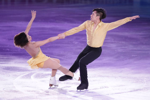 4月2日,中國選手隋文靜(左)/韓聰在表演中。當日,2017花樣滑冰世錦賽在芬蘭赫爾辛基落幕。(新華社發,馬蒂凱寧攝)