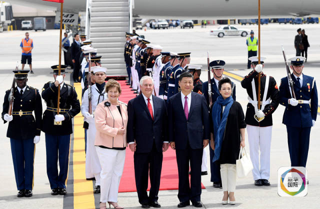 4月6日,國(guó)家主席習(xí)近平乘專機(jī)抵達(dá)美國(guó)佛羅里達(dá)州,將在海湖莊園同美國(guó)總統(tǒng)特朗普舉行中美元首會(huì)晤。習(xí)近平和夫人彭麗媛受到美國(guó)國(guó)務(wù)卿蒂勒森夫婦等熱情迎接。(新華社記者吳曉凌攝)