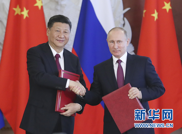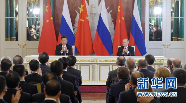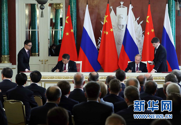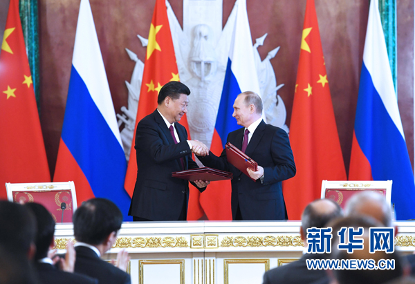 7月4日,國家主席習近平在莫斯科克里姆林宮同俄羅斯總統普京舉行會談。會談后,兩國元首簽署了《中華人民共和國和俄羅斯聯邦關于進一步深化全面戰略協作伙伴關系的聯合聲明》《中華人民共和國和俄羅斯聯邦關于當前世界形勢和重大國際問題的聯合聲明》,批準了《〈中華人民共和國和俄羅斯聯邦睦鄰友好合作條約〉實施綱要(2017年至2020年)》并見證了《中華人民共和國外交部和俄羅斯聯邦外交部關于朝鮮半島問題的聯合聲明》以及經貿、農業、能源、基礎設施建設、金融、文化、創新、媒體、信息網絡、檢驗檢疫等領域多項雙邊合作文件的交換。新華社記者 劉衛兵 攝