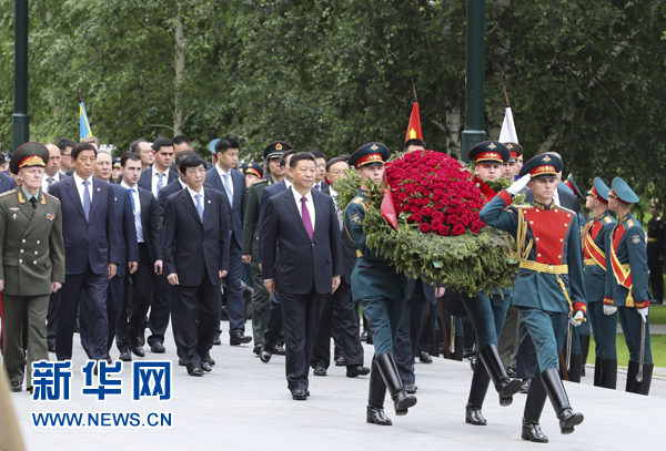 7月4日,國家主席習近平在莫斯科向俄羅斯無名烈士墓敬獻花圈。新華社記者 謝環馳 攝
