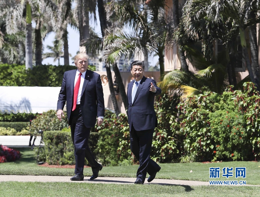 2017年4月7日,國家主席習近平在美國佛羅里達州海湖莊園同美國總統特朗普舉行中美元首第二場正式會晤。會晤后,習近平同特朗普到秀麗宜人的海湖莊園中散步,在輕松友好的氣氛中繼續就兩國友好合作進行討論。 新華社記者 蘭紅光 攝