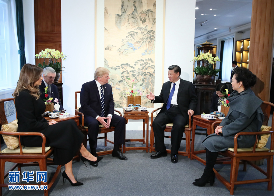 11月8日下午,國家主席習近平和夫人彭麗媛在北京故宮博物院迎接來華進行國事訪問的美國總統特朗普和夫人梅拉尼婭。兩國元首夫婦在寶蘊樓簡短茶敘。新華社記者 蘭紅光 攝
