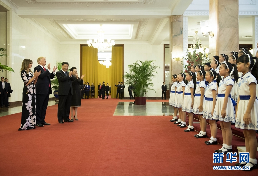 11月9日,國家主席習近平在北京人民大會堂東門外廣場舉行歡迎儀式,歡迎美利堅合眾國總統唐納德·特朗普對中國進行國事訪問。這是習近平和夫人彭麗媛同特朗普夫婦在人民大會堂欣賞文藝表演。新華社記者 李學仁 攝