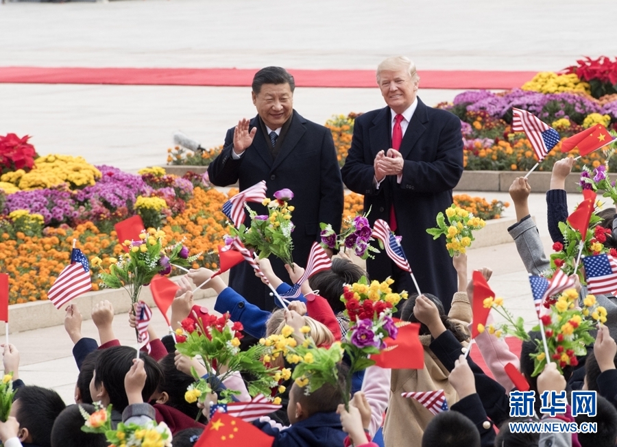 11月9日,國家主席習近平在北京人民大會堂東門外廣場舉行歡迎儀式,歡迎美利堅合眾國總統唐納德·特朗普對中國進行國事訪問。 新華社記者李學仁攝