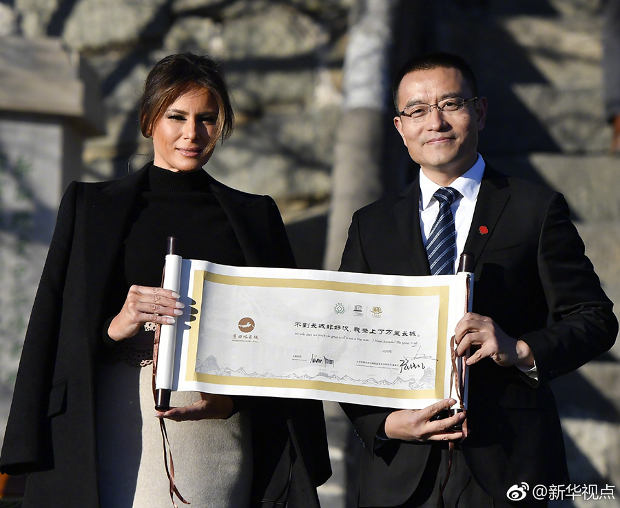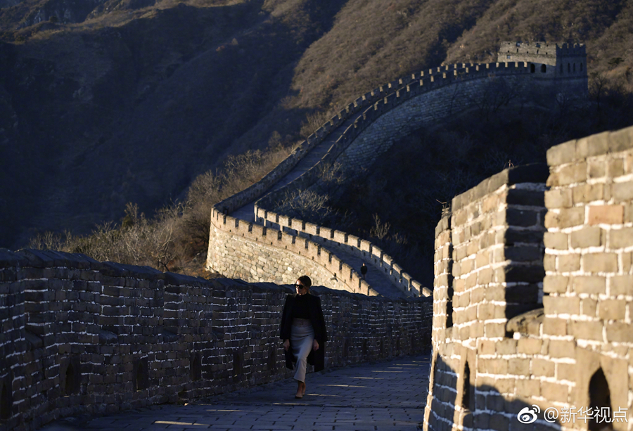 新華網北京11月10日電 11月10日下午,美國總統特朗普夫人梅拉尼婭登上慕田峪長城,獲贈“好漢證書”。北風雖然凜冽,但蜿蜒的長城氣勢磅礴,引得梅拉尼婭流連忘返。(記者朱超、燕雁 據新華社“新華視點”微博報道)?????