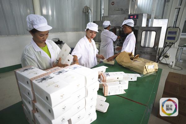 工人正在中資企業炫燁(老撾)有限公司的生產車間內包裝老撾大米。(新華社記者凌朔攝)