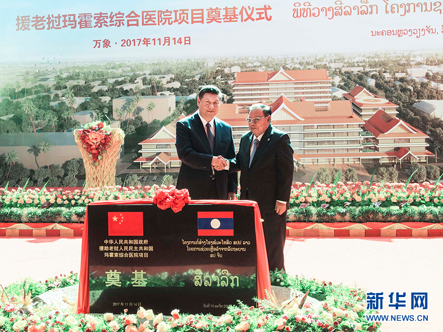 習近平同老撾人民革命黨中央委員會總書記、國家主席本揚一道出席瑪霍索綜合醫院奠基儀式
