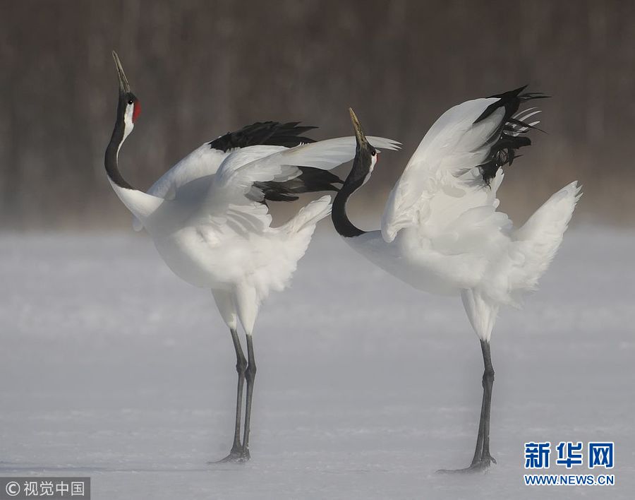 12月25日訊(具體拍攝時間不詳),日本北海道,一對丹頂鶴在冰面上翩翩起舞,動作驚人一致。(圖片來源:視覺中國)