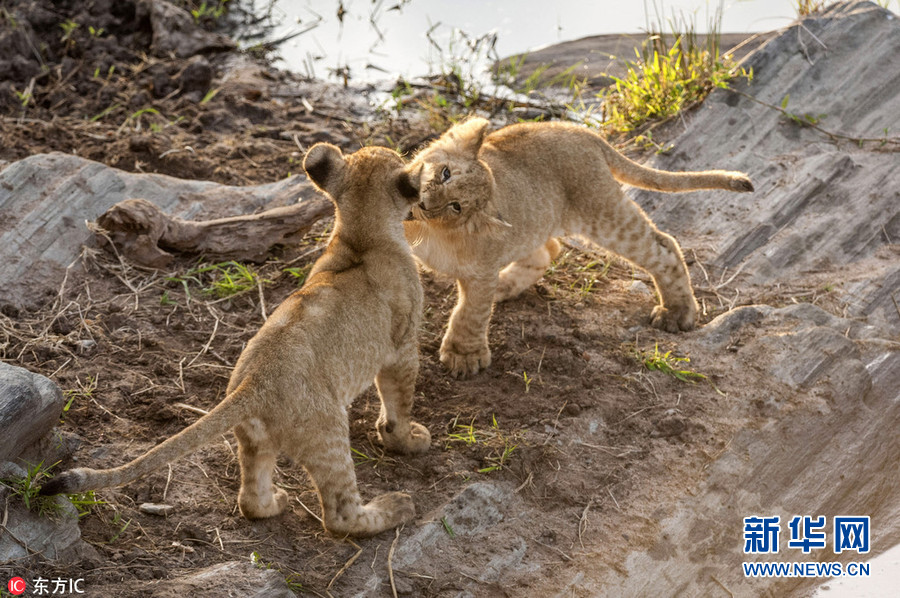 1月2日?qǐng)?bào)道(具體拍攝時(shí)間不詳),肯尼亞馬賽馬拉國(guó)家保護(hù)區(qū),64歲的攝影師Ingo Gelach在當(dāng)?shù)嘏臄z到一組有趣又暖心的照片。畫面中,兩頭小獅子站在水邊,似乎正考慮跨越面前的水域。其中一頭獅子用前腳搭在同伴的肩膀上,似乎在表達(dá)友好,又似是在鼓勵(lì)同伴不要害怕,勇敢地跨過去。(圖片來源:東方IC)
