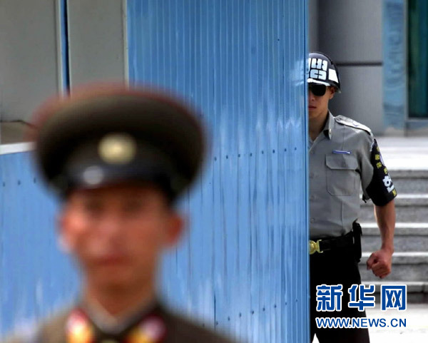 2002年9月19日拍攝的資料照片顯示,一名韓國憲兵(右)和一名朝鮮人民軍士兵在板門店朝鮮半島軍事分界線兩側執(zhí)勤。 新華社記者龔兵攝