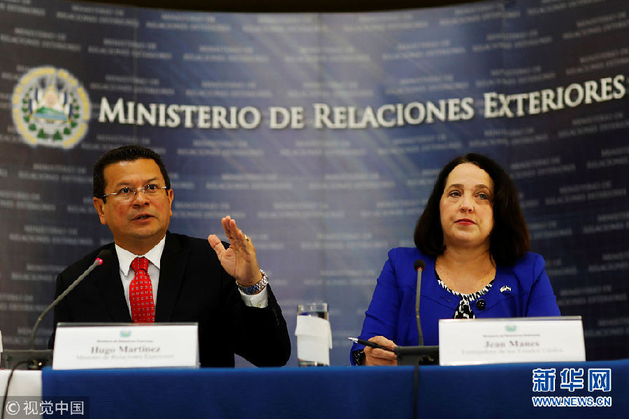 當(dāng)?shù)貢r(shí)間2018年1月8日,薩爾瓦多圣薩爾瓦多,美國(guó)駐薩爾瓦多大使Jean Manes(右)與薩爾瓦多外交部長(zhǎng)雨果·馬丁內(nèi)斯出席新聞發(fā)布會(huì)。(圖片來(lái)源:視覺(jué)中國(guó))