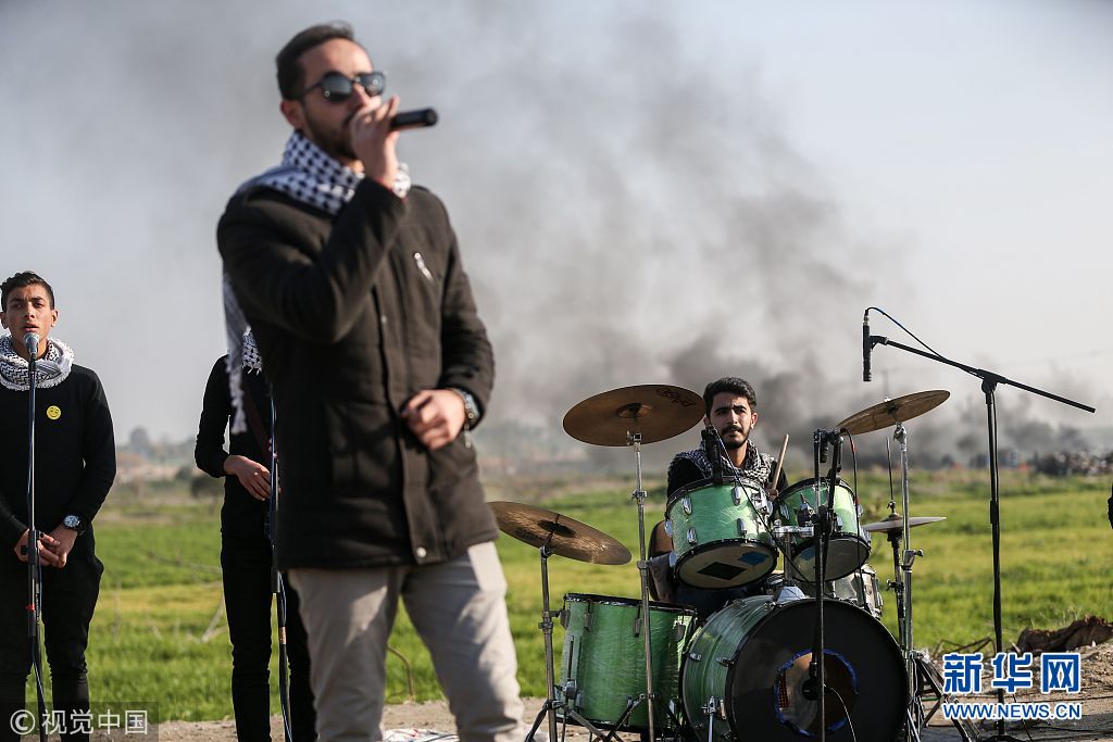 當地時間2月2日,加沙,巴勒斯坦示威者與以色列士兵發生沖突;一巴勒斯坦樂隊在沖突中開音樂會。 (圖片來源:視覺中國)
