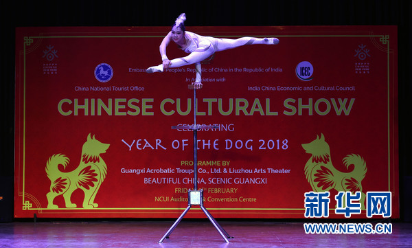2月9日,在印度首都新德里,2018“歡樂春節”活動演出現場,中國演員在表演雜技。新華網發(張迺杰攝)