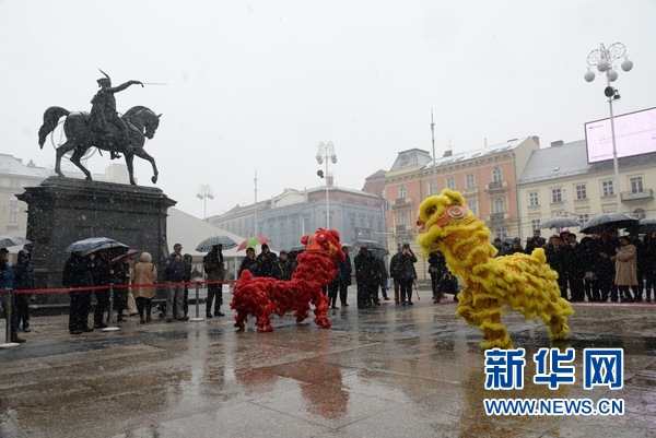 當(dāng)?shù)貢r間12日中午,來自斯洛伐克中國武術(shù)協(xié)會的舞獅表演隊冒雪表演傳統(tǒng)舞獅節(jié)目,中國駐克羅地亞大使胡兆明和薩格勒布市長米蘭·班迪奇為舞獅點睛,熱鬧的鑼鼓和一紅一黃兩頭“獅子”吸引了大批市民駐足觀看。