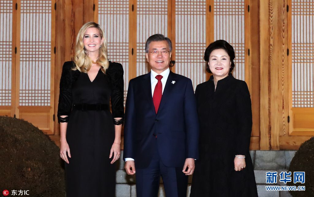 當(dāng)?shù)貢r(shí)間2018年2月23日,韓國(guó)首爾,韓國(guó)總統(tǒng)文在寅夫婦在青瓦臺(tái)設(shè)晚宴,歡迎伊萬(wàn)卡來(lái)訪(fǎng)。美國(guó)總統(tǒng)特朗普之女、總統(tǒng)助理伊萬(wàn)卡率領(lǐng)的美國(guó)代表團(tuán)23日抵韓進(jìn)行訪(fǎng)問(wèn),并將出席平昌冬奧會(huì)閉幕式。(圖片來(lái)源:東方IC)