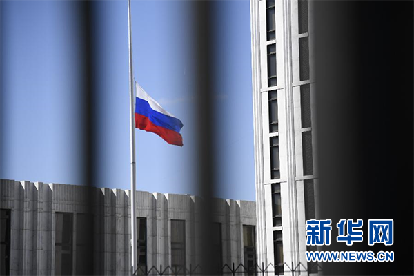 這是3月26日在美國首都華盛頓拍攝的俄羅斯駐美國大使館內的俄羅斯國旗。新華社記者楊承霖攝