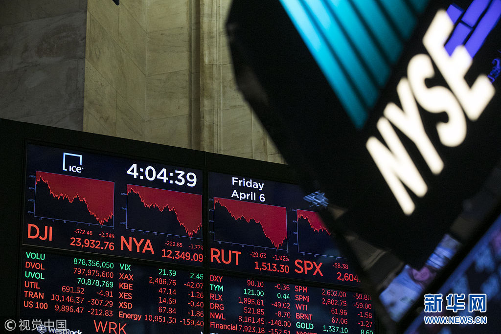 4月6日,美國紐約,紐約證交所。對中美貿(mào)易摩擦升級的擔(dān)憂6日彌漫華爾街,美股今天再度走低。道瓊斯工業(yè)指數(shù)當(dāng)天一度下挫接近800點(diǎn)。當(dāng)天,紐約股市三大股指全部收跌。道指報(bào)收于23932.76點(diǎn),跌2.34%;標(biāo)準(zhǔn)普爾500指數(shù)收于2604.47點(diǎn),跌2.19%;納斯達(dá)克綜合指數(shù)收于6915.11點(diǎn),跌2.28%。(圖片來源:視覺中國)