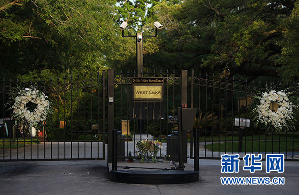 4月18日,鮮花擺放在美國前總統老布什和小布什位于美國休斯敦的住所大門前。新華社發(李怡今攝)