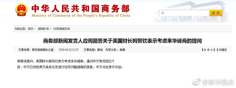 新華網北京4月22日電? 商務部網站消息,有媒體提問:美國財長姆努欽表示考慮來華磋商,請問中方有何回應?答:中方已收到美方希來北京進行經貿問題磋商的信息,中方對此表示歡迎。 ????(據新華社“新華視點”微博報道)