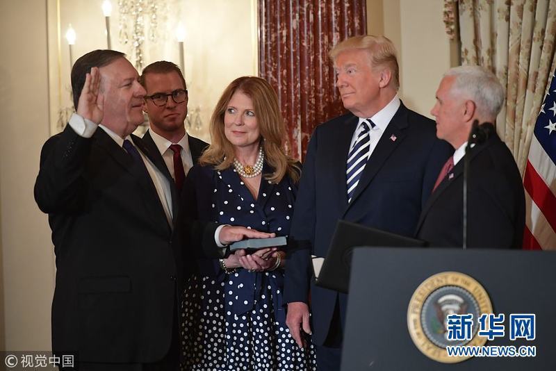 當天,美國國務院舉行儀式,蓬佩奧正式宣誓就任美國第70任國務卿。他在演講中說,當前美國的安全、繁榮和自由面臨著很多威脅,他將帶領國務院團隊全力應對這些威脅,確保美國一直是世界舞臺上“受尊敬和有原則的領導者”。