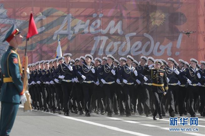 5月9日,在俄羅斯圣彼得堡,俄軍士兵參加閱兵式。5月9日是俄羅斯衛國戰爭勝利紀念日。 新華社發(莫京娜攝)