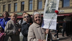 在衛國戰爭中犧牲或戰后去世的老戰士的親友及后代9日下午帶著老戰士的照片或畫像,在莫斯科市3條主要街道舉行了“不朽軍團”游行紀念活動,有近百萬民眾參加。
