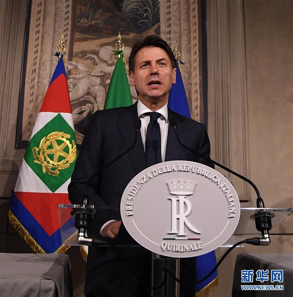 5月27日,在意大利首都羅馬,意新任總理孔特發表講話。據當地媒體報道,孔特27日晚間與總統馬塔雷拉會面并提交擬定的內閣成員名單時,馬塔雷拉否決了由意大利聯盟黨和五星運動力推的持疑歐立場的經濟學家保羅·薩沃納出任財政部長。孔特向總統提出放棄組閣任務請求,請求得到總統確認。新華社發(阿爾貝托·林格里亞攝)