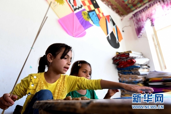 5月29日,在阿富汗首都喀布爾,希杰蘭(左)和妹妹在作坊內扎風箏。對于阿富汗這個飽經戰火洗禮的國度,風箏是人們難得的娛樂品。不少當地孩子親手制作風箏貼補家用,可謂窮人的孩子早當家。九歲的希杰蘭過去幾年共制作了上萬個風箏。今年“六一”國際兒童節來臨之際,記者一行來到希杰蘭與家人位于喀布爾郊區的風箏作坊。在略顯簡陋的房間內,大大小小、五顏六色的紙張隨處可見,不足20平方米的作坊在陽光下如同一個彩色世界。新華社記者 代賀 攝