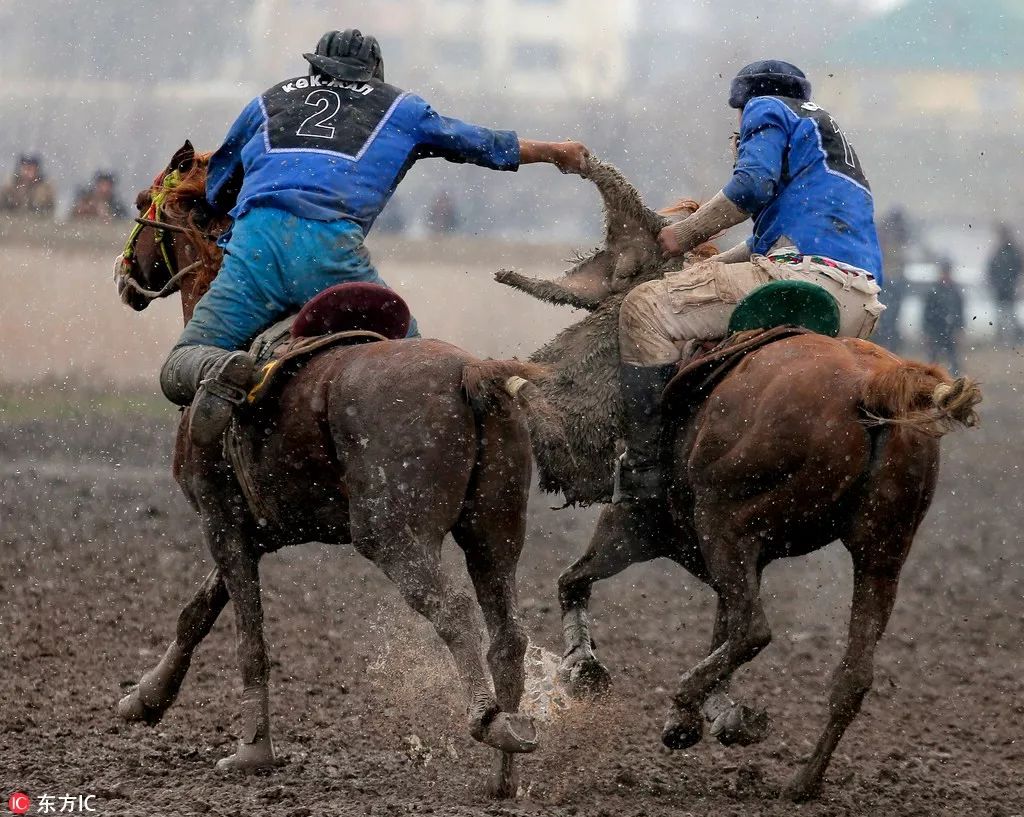 吉爾吉斯斯坦比什凱克,當地舉行“馬背叼羊”比賽。