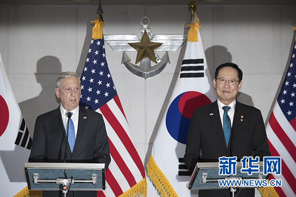 6月28日,在韓國首爾,韓國國防部長官宋永武(右)與到訪的美國國防部長馬蒂斯出席新聞發(fā)布會。新華社發(fā)(聯(lián)合采訪團(tuán)供圖)