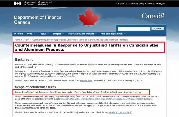 加拿大財政部官網(wǎng)發(fā)布的公告,標(biāo)題可以說是相當(dāng)?shù)刂笔阈匾芰耍骸秾幽么箐撲X產(chǎn)品受到不公平關(guān)稅待遇的反擊措施》(Countermeasures in Response to Unjustified Tariffs on Canadian Steel and Aluminum Products)。抱怨三連:countermeasures(對抗措施), in Response to(對……做出反應(yīng)),unjustified(不公平的)——看得出,加拿大是真生氣了。
