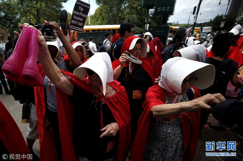 當地時間2018年7月31日,美國紐約,女性示威者扮成美劇《使女的故事》中的“使女”在亞歷山大·漢密爾頓海關大樓前示威,抗議美國總統特朗普和副總統麥克·彭斯。她們手持鞋子,代表被迫與父母分離的移民兒童。(圖片來源:視覺中國)