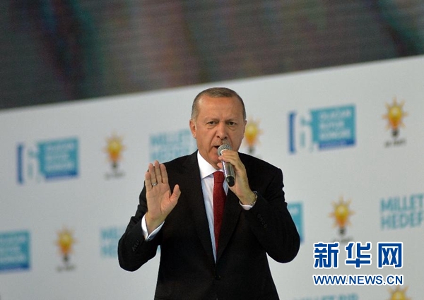 8月18日,在土耳其首都安卡拉,土耳其總統埃爾多安在執政黨正義與發展黨年度大會上發表演講。 土耳其總統埃爾多安18日表示,土耳其不會向經濟威脅屈服。 新華社發(穆斯塔法·卡亞攝)