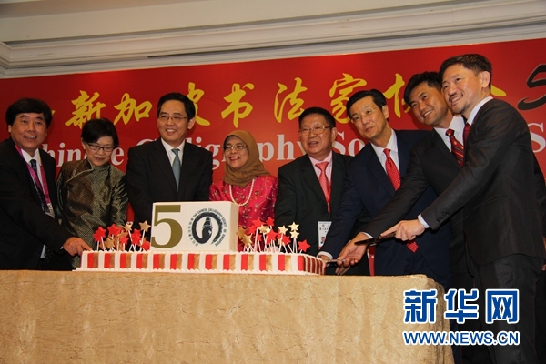 中國(guó)駐新加坡大使洪小勇(左三)、新加坡總統(tǒng)哈莉瑪·雅各布(左四)和新加坡書法家協(xié)會(huì)會(huì)長(zhǎng)陳聲桂,在新加坡書法家協(xié)會(huì)成立50周年慶午宴上切蛋糕。記者王麗麗 攝