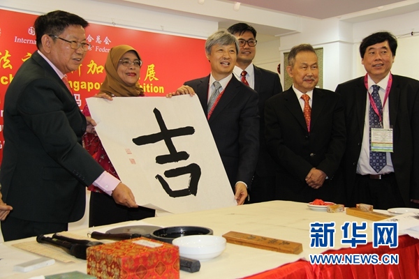新加坡馬來(lái)族女總統(tǒng)哈莉瑪興致勃勃地?fù)]毫?xí)鴮懥藵h字“吉”,并觀賞了書法家代表的現(xiàn)場(chǎng)書法表演。哈莉瑪在賀詞中說(shuō),中華書法是眾多新加坡人學(xué)習(xí)的傳統(tǒng)藝術(shù),新加坡書法家協(xié)會(huì)通過(guò)開設(shè)書法課程和舉辦揮春大會(huì)等方式,在新加坡多元文化背景下為加深跨文化交流做出了貢獻(xiàn)。此次國(guó)際書法交流大展展出的作品風(fēng)格各異,無(wú)疑能帶動(dòng)書法同道的藝術(shù)交流。