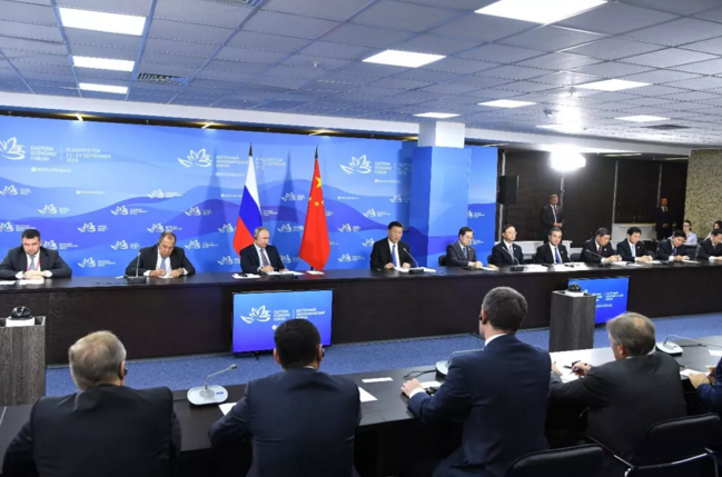 9月11日,國家主席習(xí)近平在符拉迪沃斯托克和俄羅斯總統(tǒng)普京共同出席中俄地方領(lǐng)導(dǎo)人對話會。 新華社記者 饒愛民攝