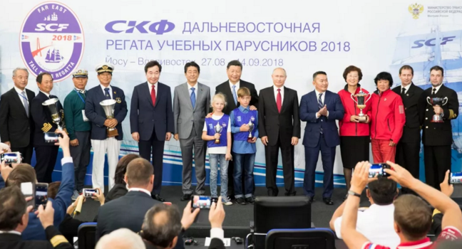 9月12日,第四屆東方經(jīng)濟論壇全會在符拉迪沃斯托克舉行。中國國家主席習(xí)近平、俄羅斯總統(tǒng)普京、蒙古國總統(tǒng)巴特圖勒嘎、日本首相安倍晉三、韓國總理李洛淵等出席。這是全會后,與會各國領(lǐng)導(dǎo)人共同出席第三屆“遠(yuǎn)東杯”國際帆船拉力賽第一賽段頒獎儀式。新華社記者 黃敬文 攝