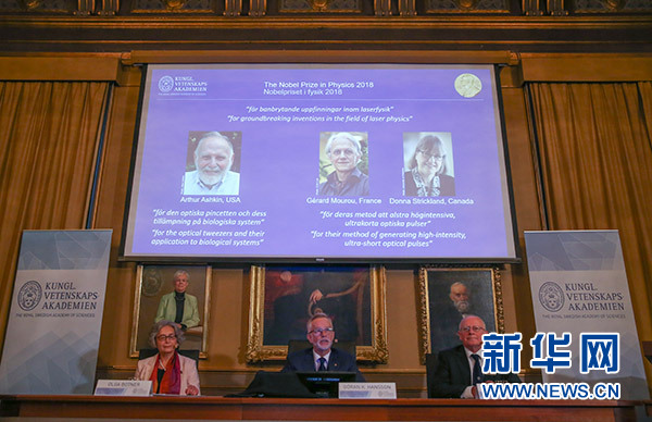 10月2日,瑞典皇家科學院在斯德哥爾摩舉行新聞發布會,公布2018年諾貝爾物理學獎獲得者。新華社記者 葉平凡 攝