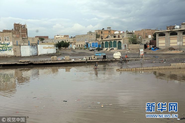 當(dāng)?shù)貢r間2018年10月23日,也門薩那,連日暴雨導(dǎo)致街道積水嚴重。(圖片來源:視覺中國)