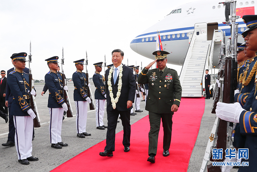 當?shù)貢r間上午11時45分許,習近平乘坐專機抵達馬尼拉阿基諾國際機場。習近平步出艙門,菲律賓政府高級官員在舷梯旁熱情迎接,軍樂隊奏迎賓曲。禮兵分列紅地毯兩側(cè)。菲律賓青年向習近平獻上茉莉花環(huán)。